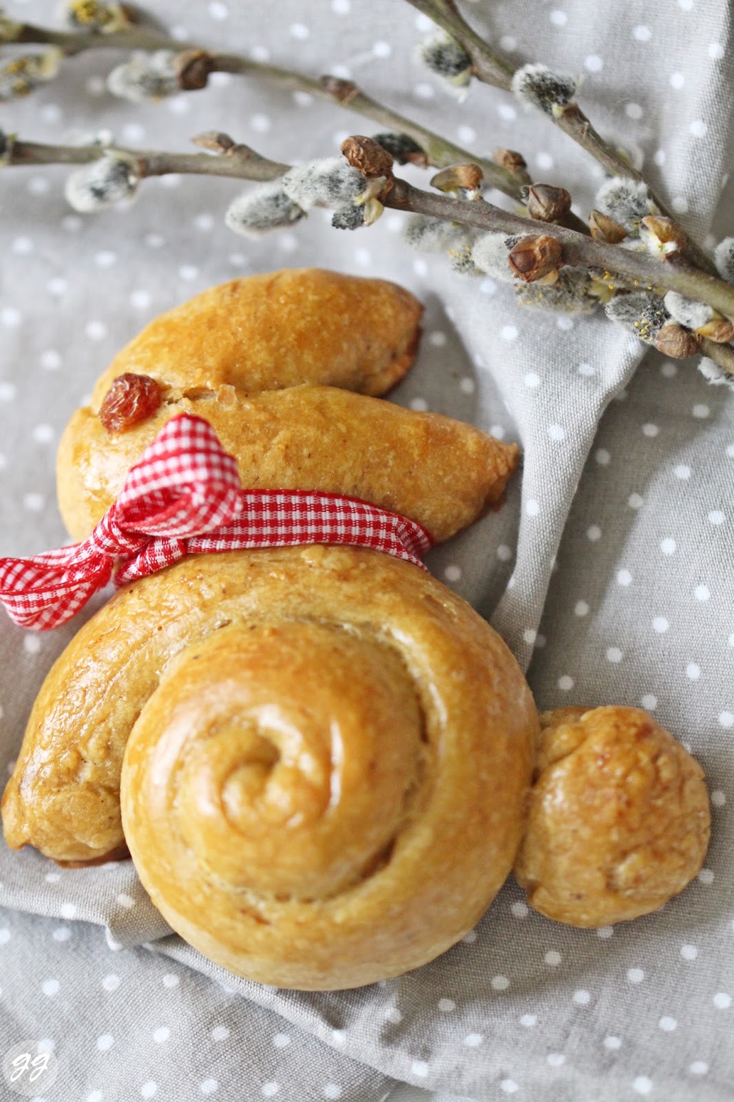 - Nun den Teig in 6 gleich große Portionen teilen. Aus einer Teigportion werden nun folgende Teile gefertigt: 1 Teel. Teig zu einer Kugel rollen - Schwanz des Häschens; 2 Teel. Teig zu einem runden Oval kneten und mit dem Messer einen Schnitt für die Ohren setzen- Kopf des Häschens; aus dem restlichen Teig einen ca 30 cm langen Strang ausrollen und zu einer Schnecke aufdrehen. Nun die Teile wie auf dem Bild zusammen setzen. Zum Schluß je eine Rosine als Auge aufsetzen