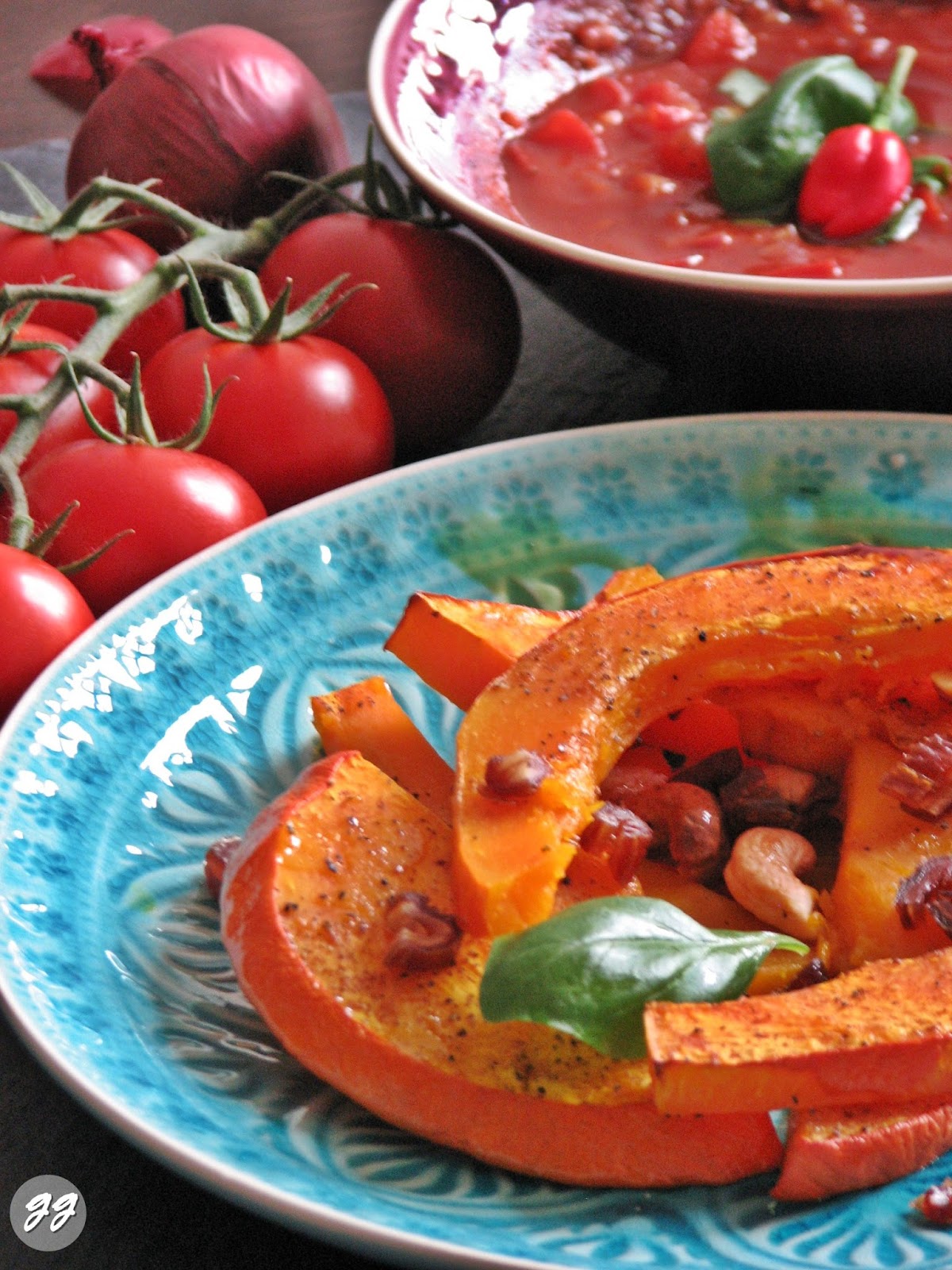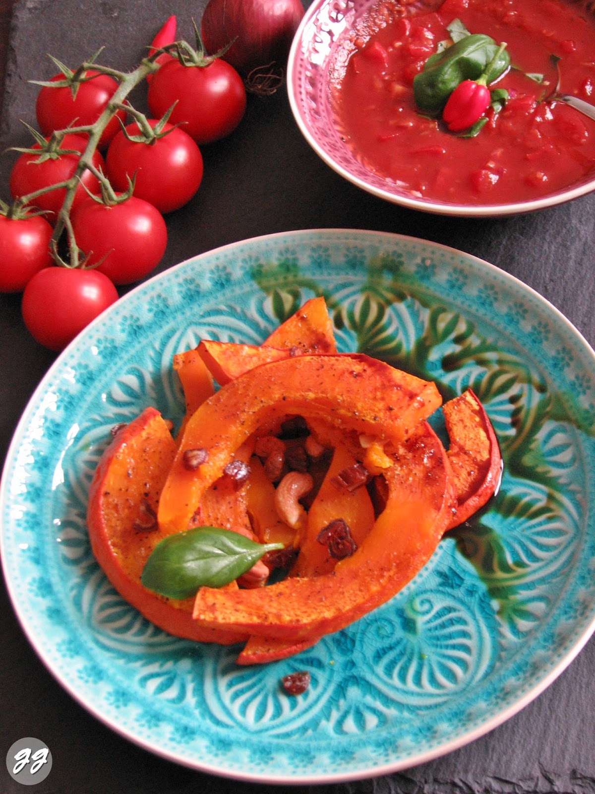 - Kürbisspalten aus dem Backofen holen, auf Tellern verteilen und mit den Datteln bestreuen. Wer einen noch intensiveren Geschmack möchte, darf gerne noch etwas Kürbiskernöl darüber träufeln