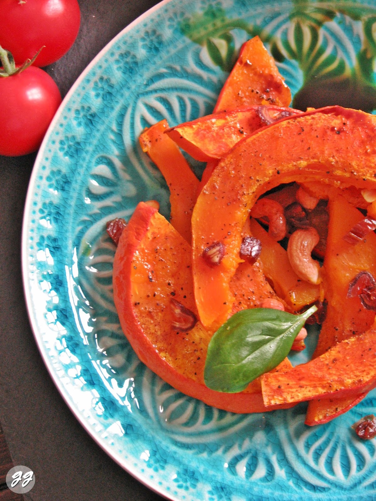 - Cashews über den Kürbisspalten verteilen