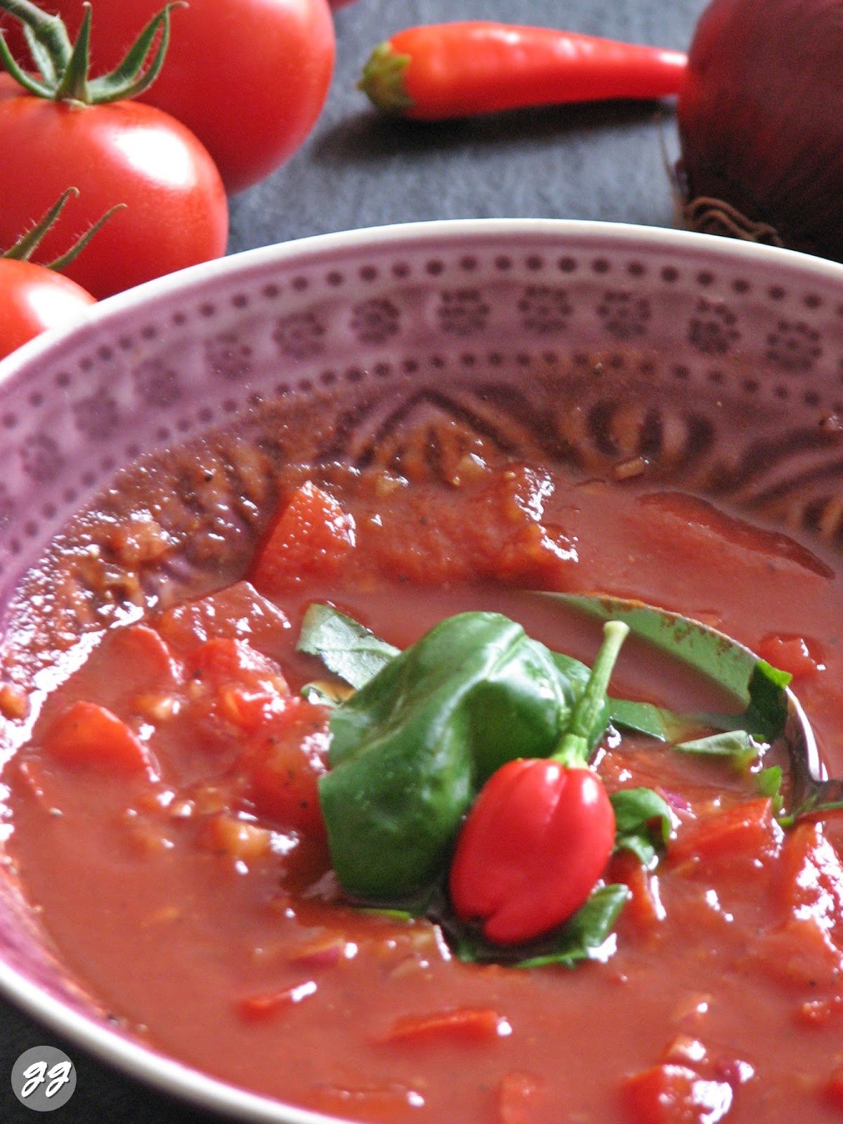 - in einer Schüssel das Tomatenmark mit etwas Wasser verrühren, Tomatenwürfel, Zwiebeln und Chilischote dazu geben und mit Pfeffer und Salz abschmecken