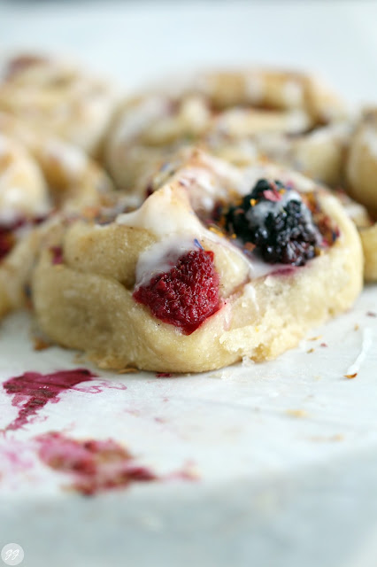 {Rezept} Sommerliche Beerenschnecken mit Wildblütenglasur