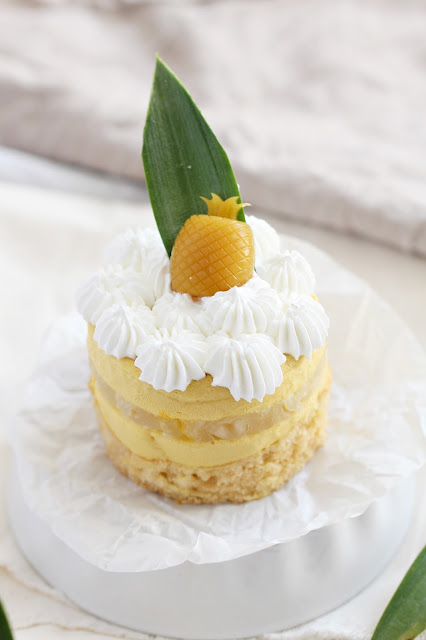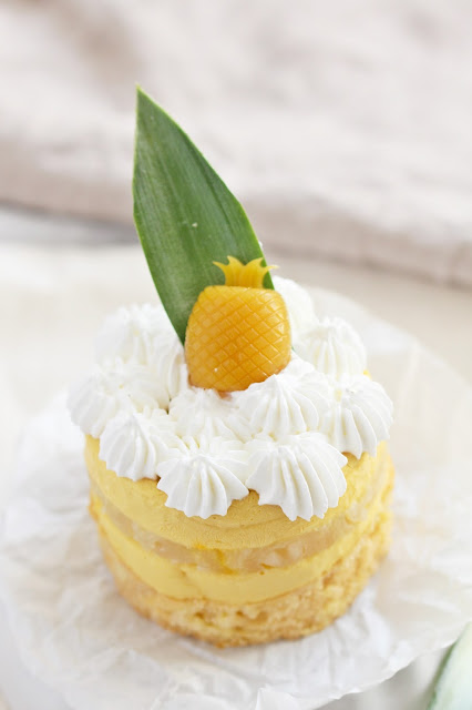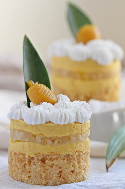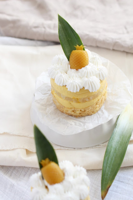 - Nun je eine Ananasscheibe auf die Teigböden legen, dann Ananascreme einfüllen und glatt streichen. Zuletzt die Kokossahne hineinfüllen und ebenfalls glätten.