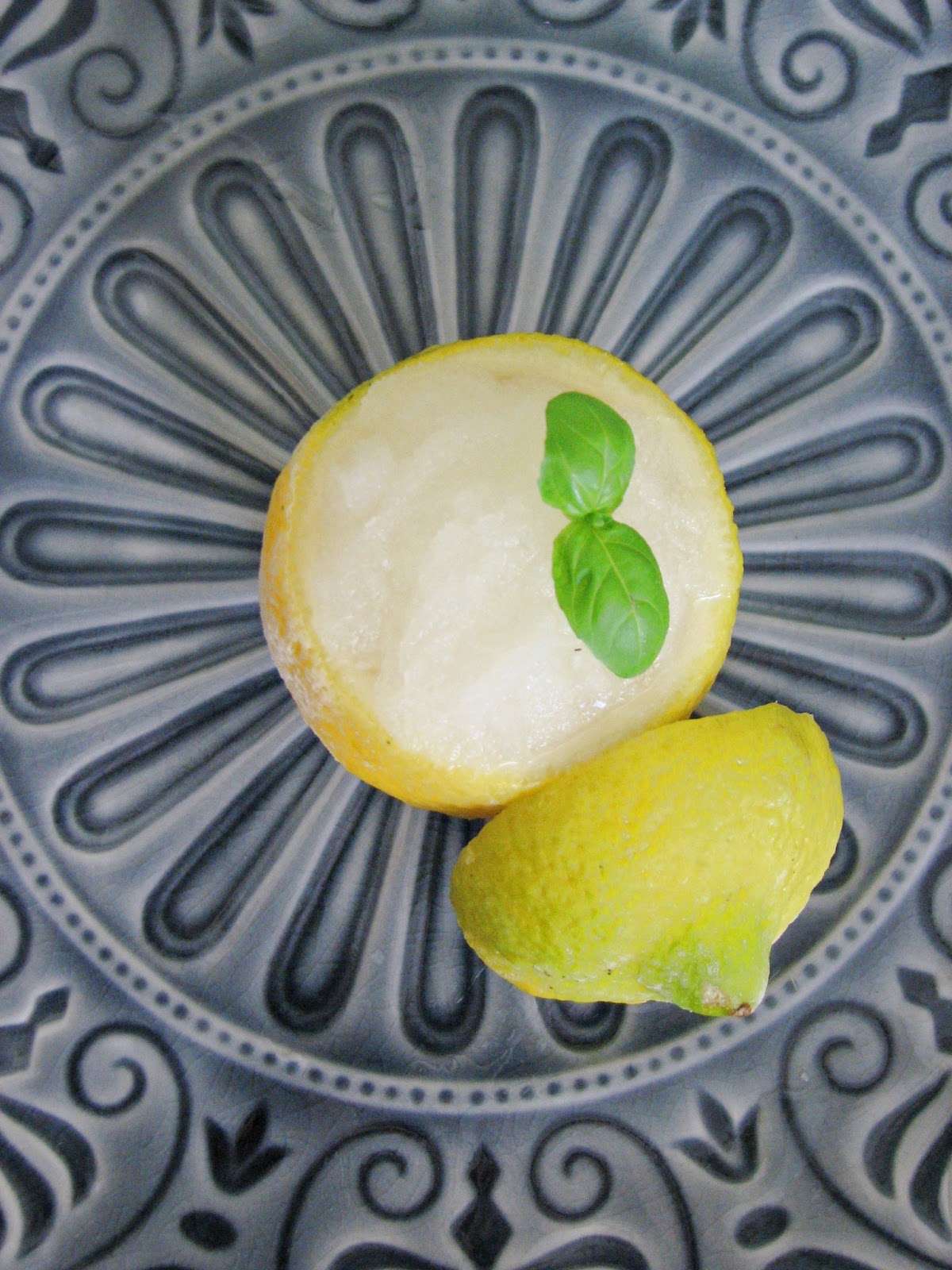 Kurz vor dem servieren das Sorbet in einen Spritzbeutel füllen und in die Zitronen spritzen. Mit Basilikumblättern dekorieren.